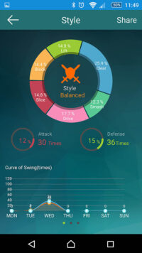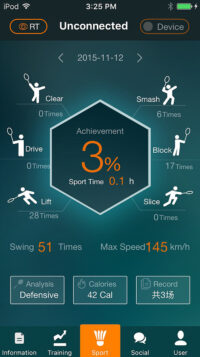 บันทึกข้อมูลสำคัญเช่นความเร็วในการตี ความแรงในการตี องศาในการตี แคลอรี่ที่เผาผลาญ ลักษณะการตีแบดมินตัน 6 ลักษณะ คือ “Smash”, “Lift”, “Clear”, “Block”, “Slice”, “Drive” จะถูกรวบรวมสำหรับการวิเคราะห์รูปแบบการเล่นของคุณ รวมถึงฟังก์ชั่น Social networking การฝึกอบรมการตี จะอยู่ใน application ซึ่งทั้งหมดอยู่ในรูปแบบที่ง่ายต่อการอ่านเพื่อวัตถุประสงค์ในการปรับปรุงเกมของคุณ